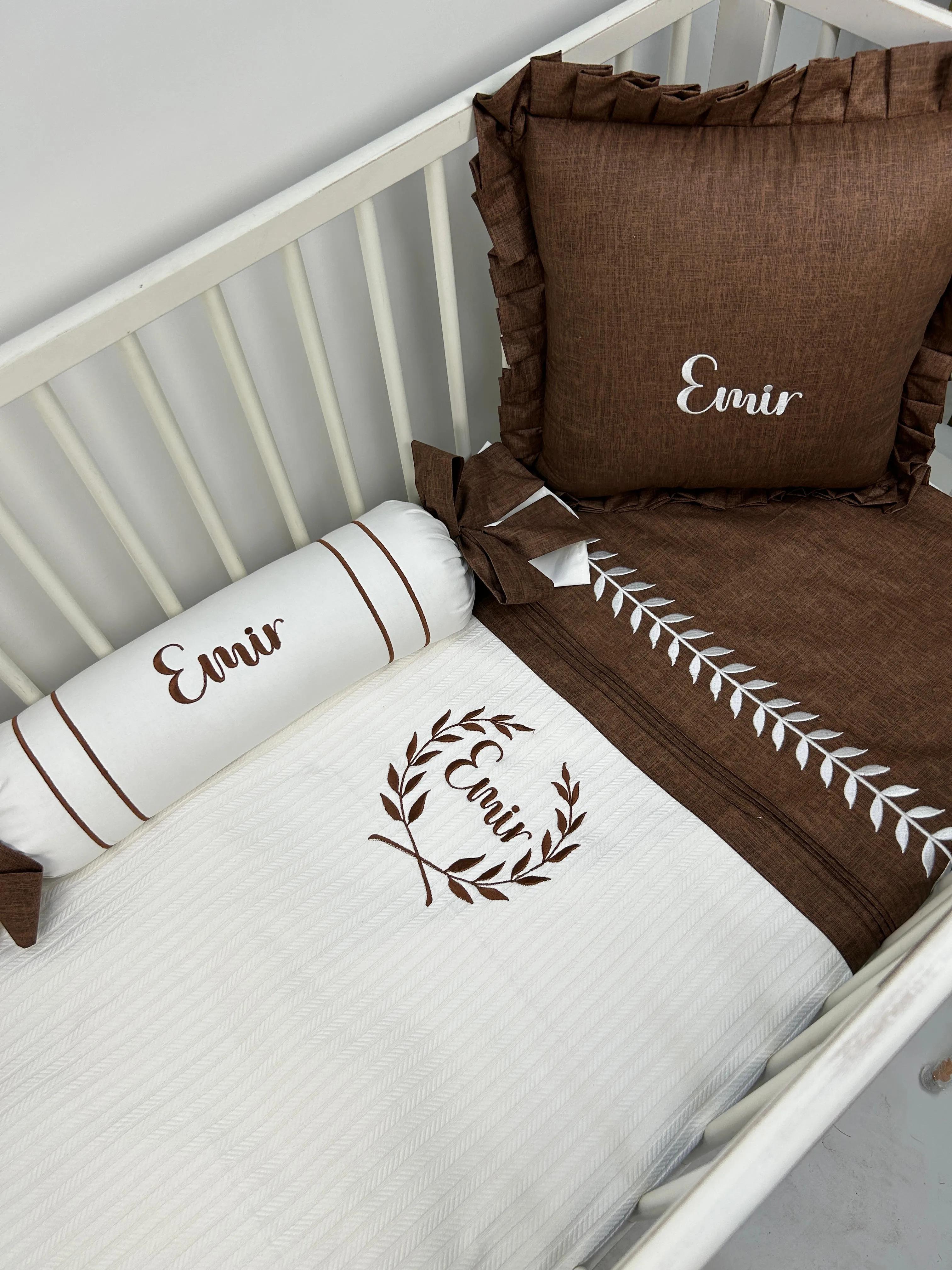 Pike takımı 5 parça beyaz örgü pike - kahverengi kırçıllı poplin
