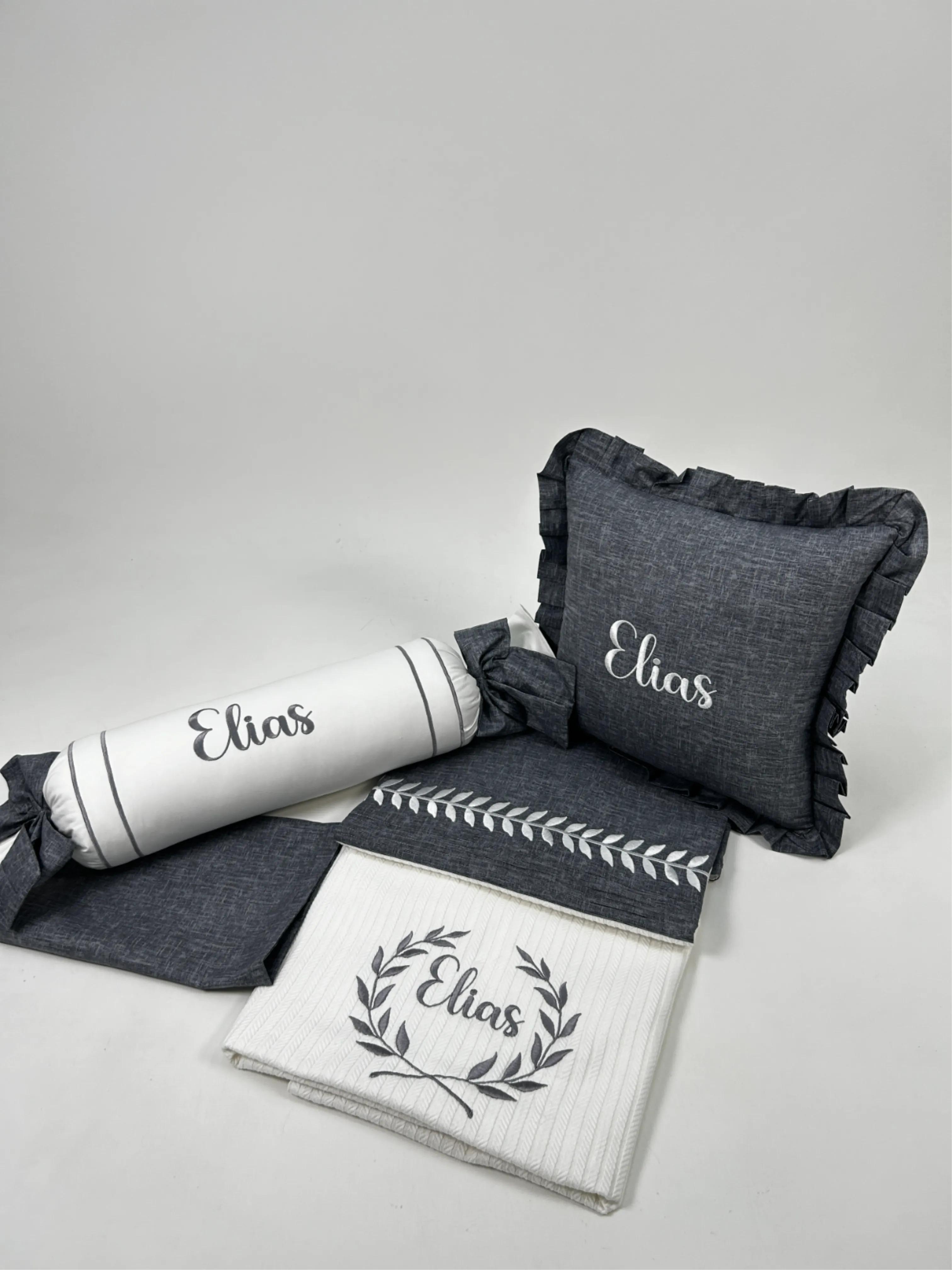 Pike takımı 5 parça beyaz örgü pike - koyu gri kırçıllı poplin