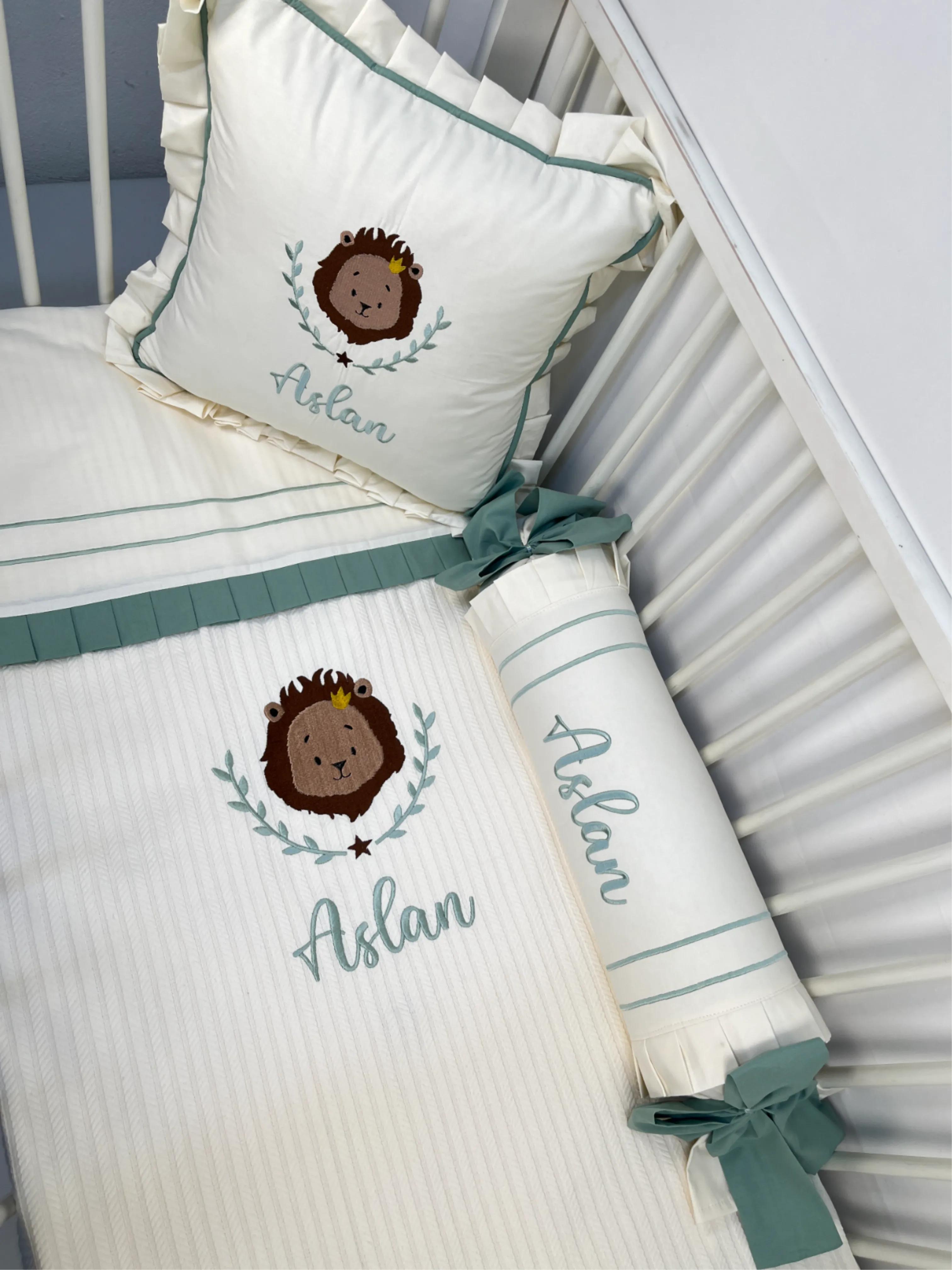 Pike takımı 5 parça krem örgü pike - krem ve yeşil rengi poplin