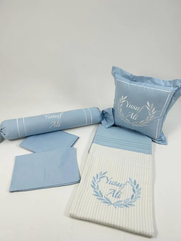 Pike takımı 5 parça krem örgü pike - mavi poplin