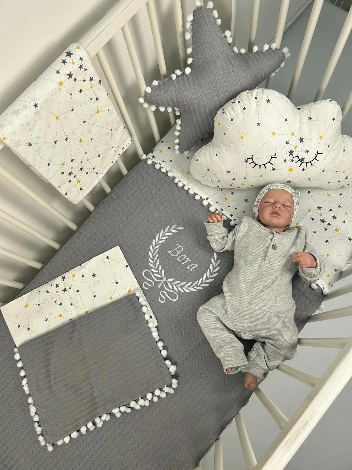 Pike takımı 6 parça isim ve desen işlemeli gri örgü pike - gri samanyolu yıldızlı poplin