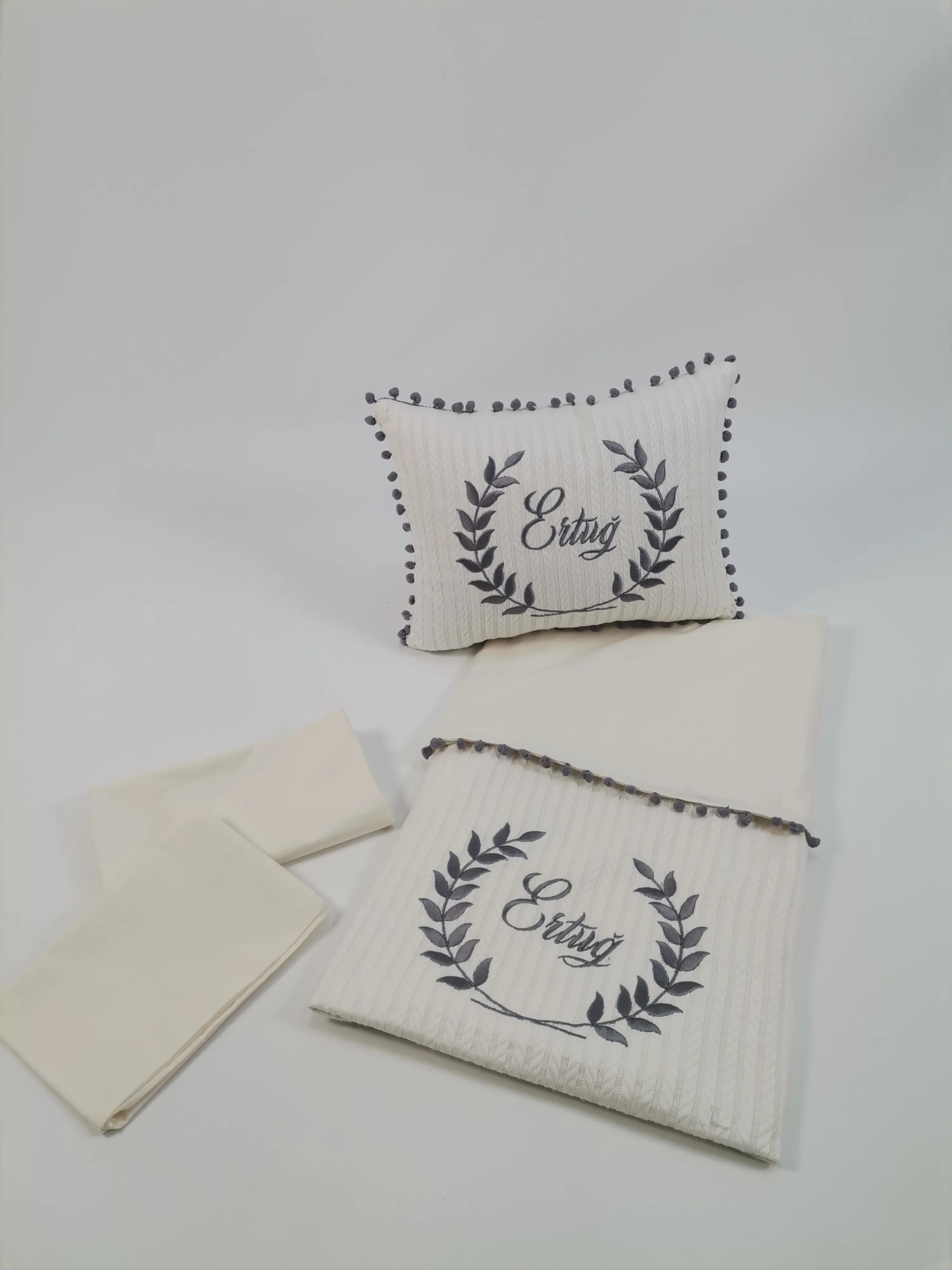 PİKE TAKIMI GRİ PONPONLU KREM ÖRGÜ PİKE - V3 KREM POPLİN