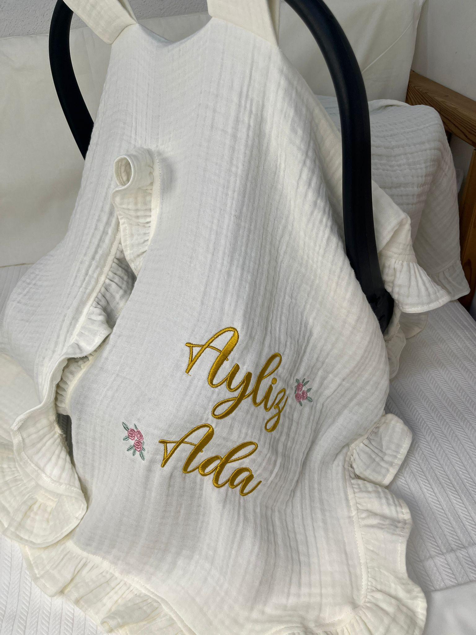 4 Kat müslin kumaştan üretilen isim işlemeli Puset Örtüsü