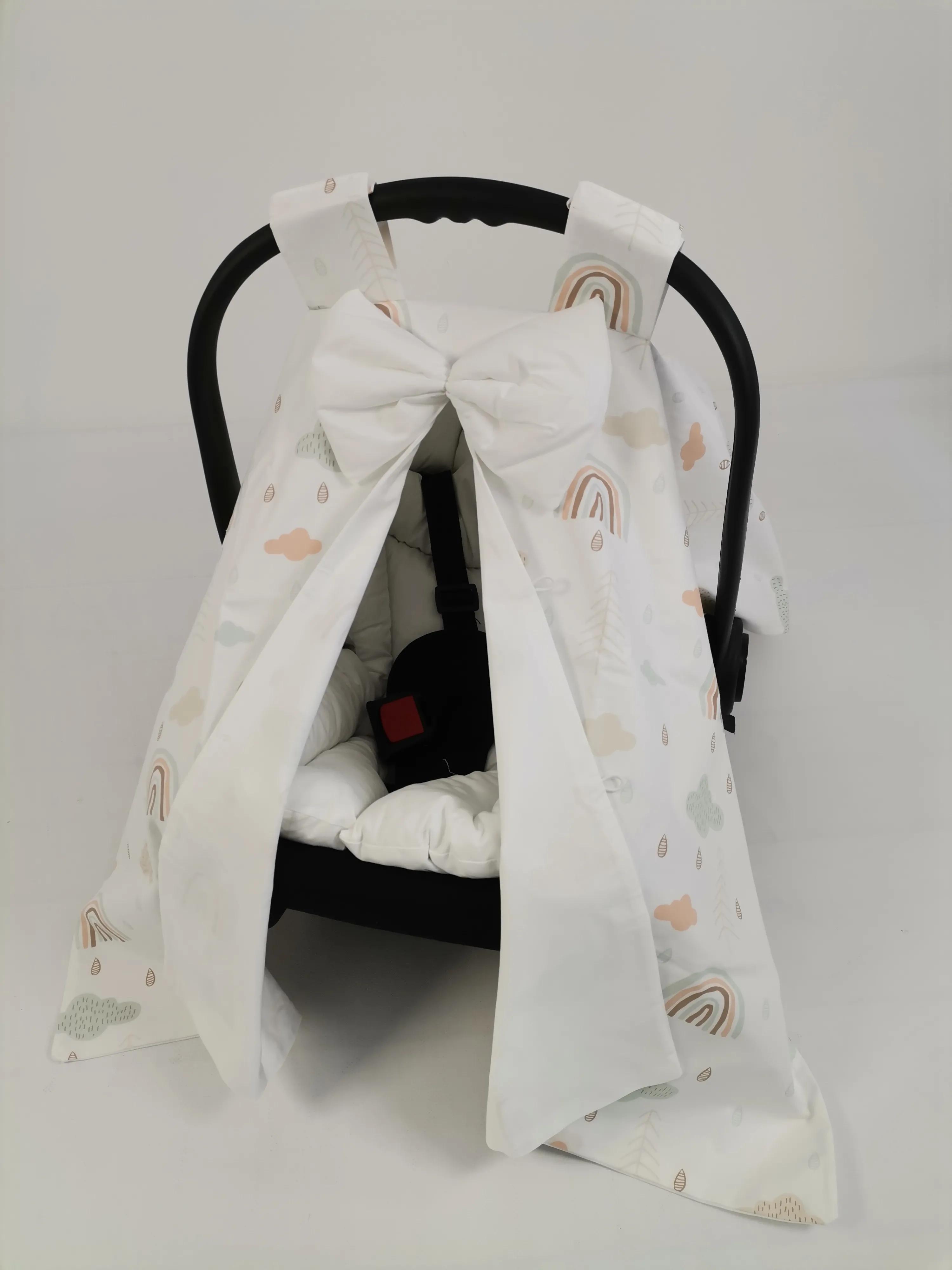 beyaz poplin ve gökkuşağı desenli poplin kumaştan üretilen Puset Örtüsü