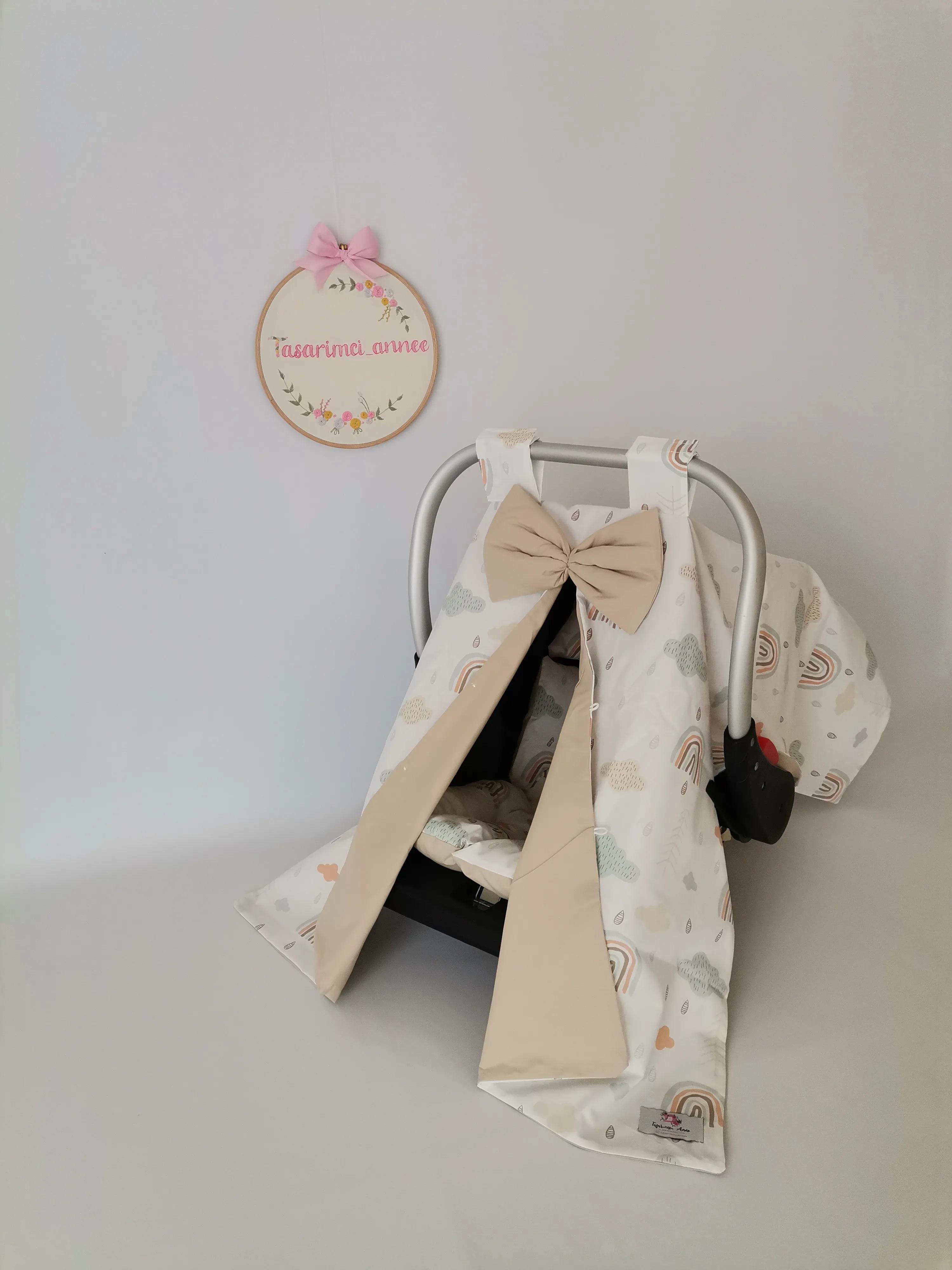 Gökkuşağı desenli poplin ve Bej v12(vizon) rengi Poplin kumaştan üretilen Puset Örtüsü