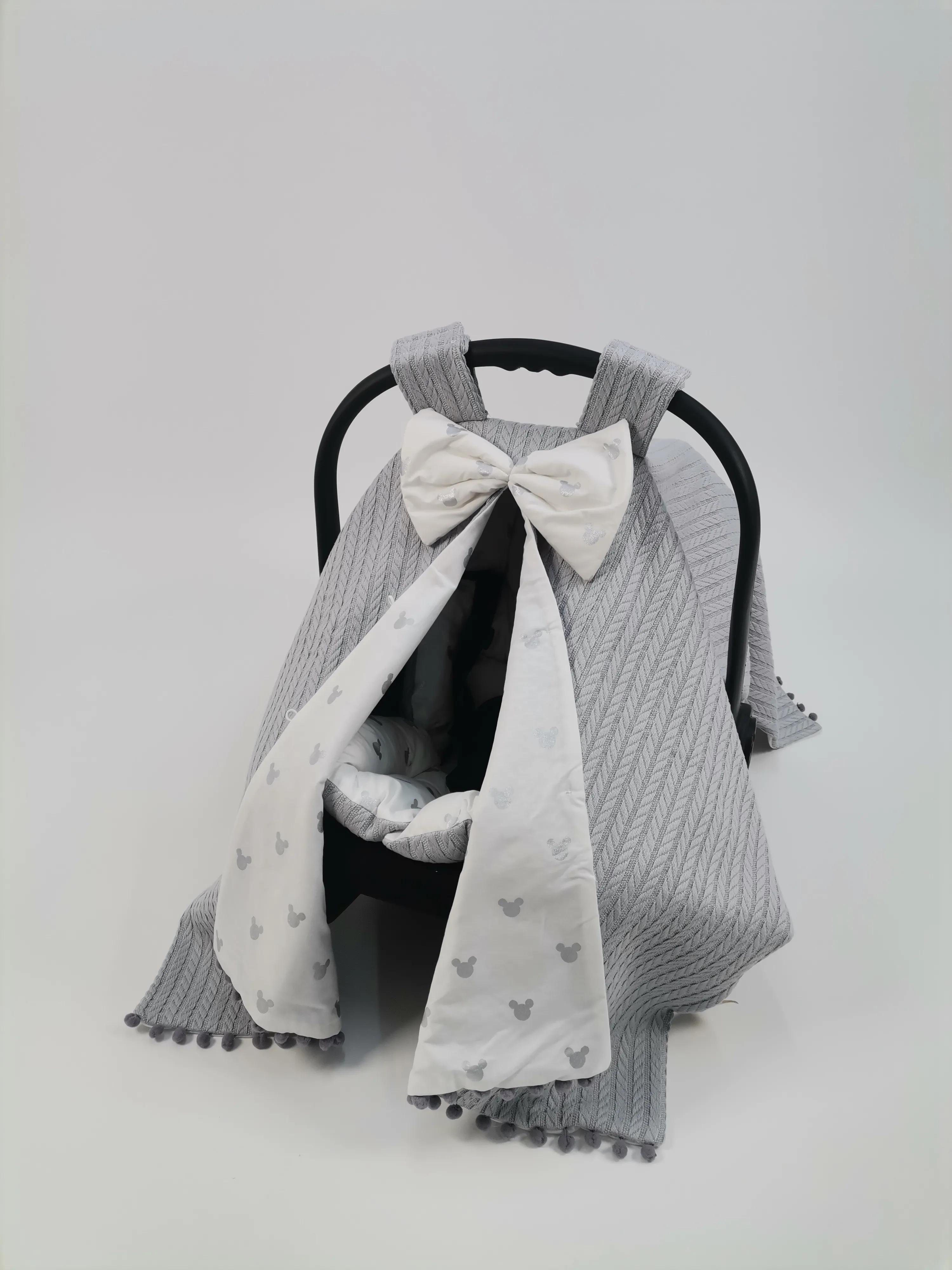 Gri Örgü Pike ve Gümüş Mickey Poplin kumaştan üretilen Puset Örtüsü