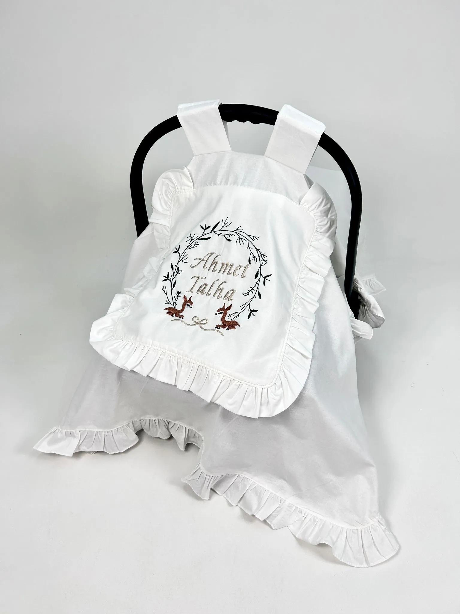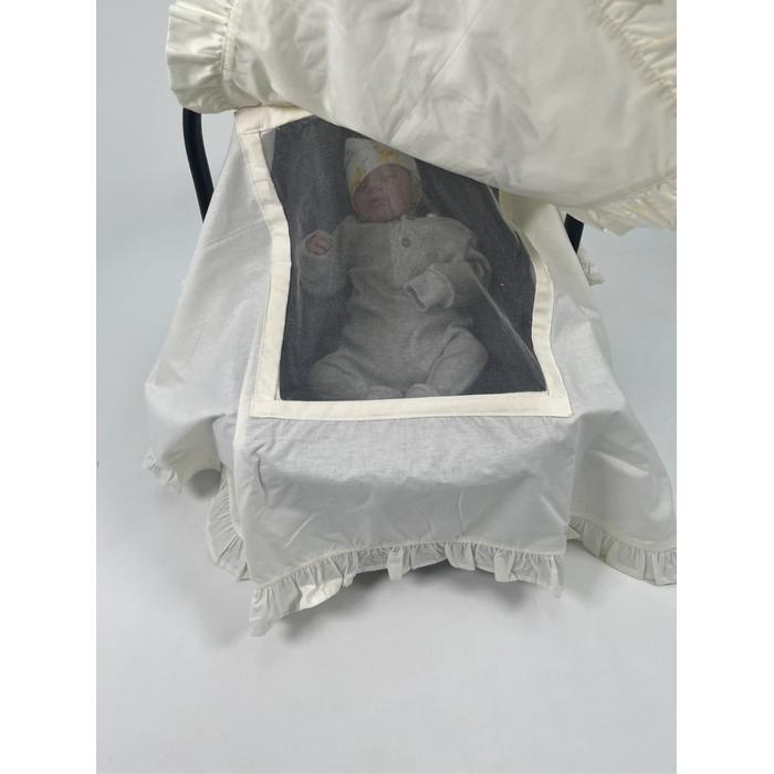 Beyaz Poplin kumaştan üretilen tek kat, kapak ve fırfır detaylı Puset Örtüsü