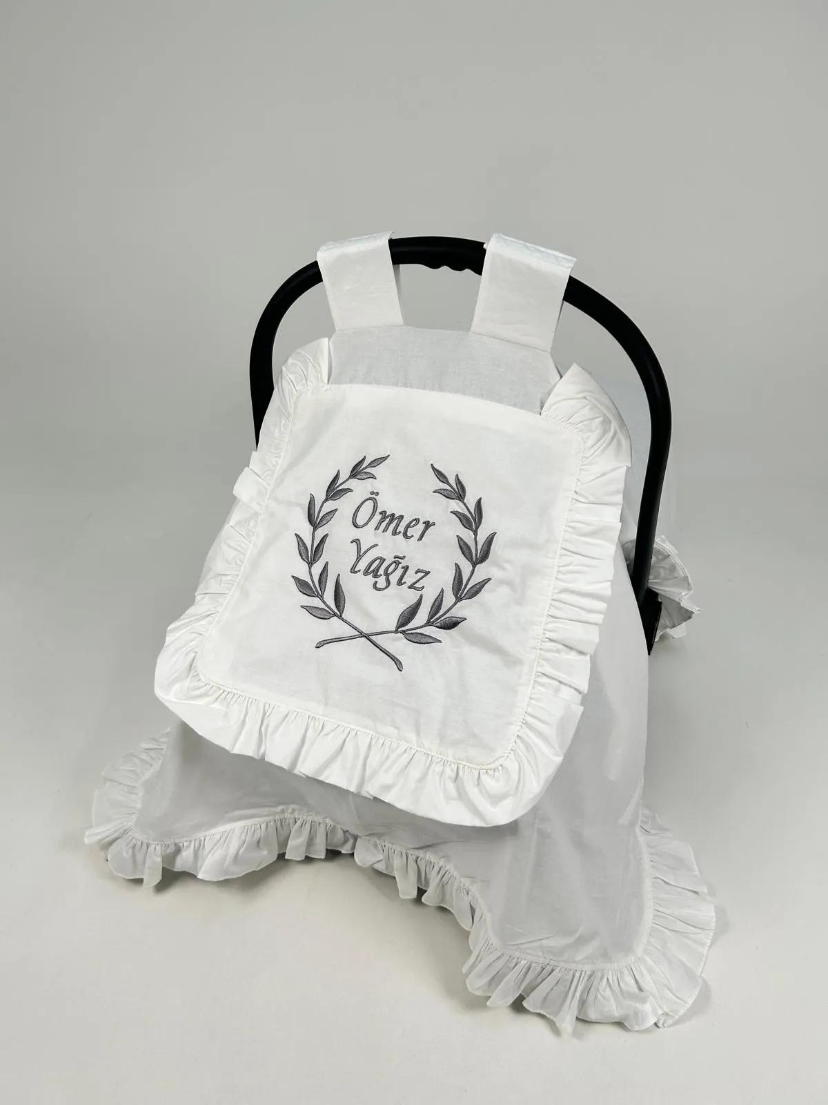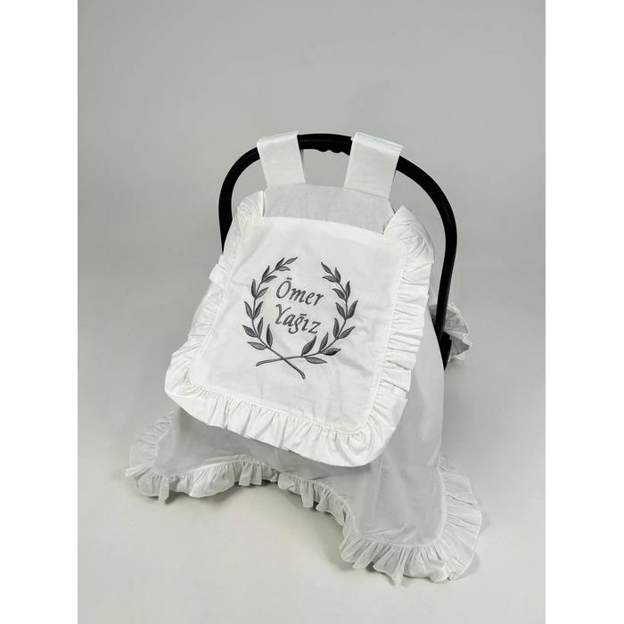 Beyaz Poplin kumaştan üretilen tek kat, kapak ve fırfır detaylı Puset Örtüsü