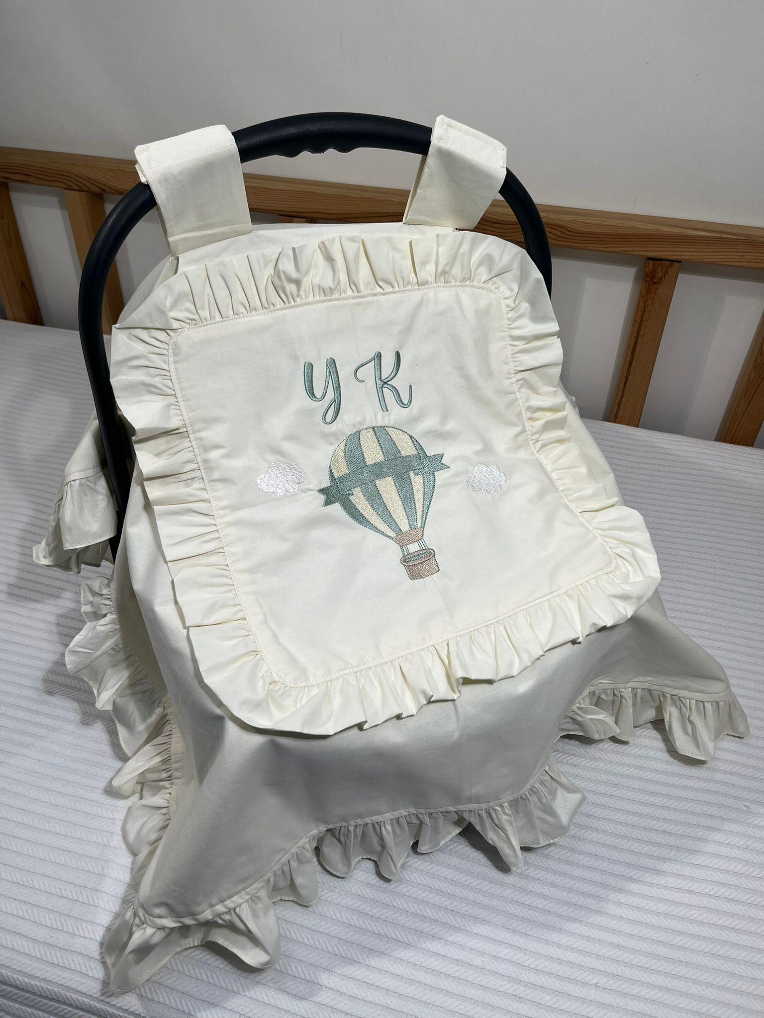 Krem Poplin kumaştan üretilen tek kat, kapak ve fırfır detaylı Puset Örtüsü