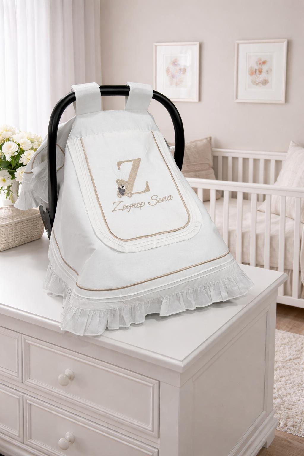 Beyaz Poplin kumaştan üretilen çift kat, kapak ve fırfır detaylı Puset Örtüsü