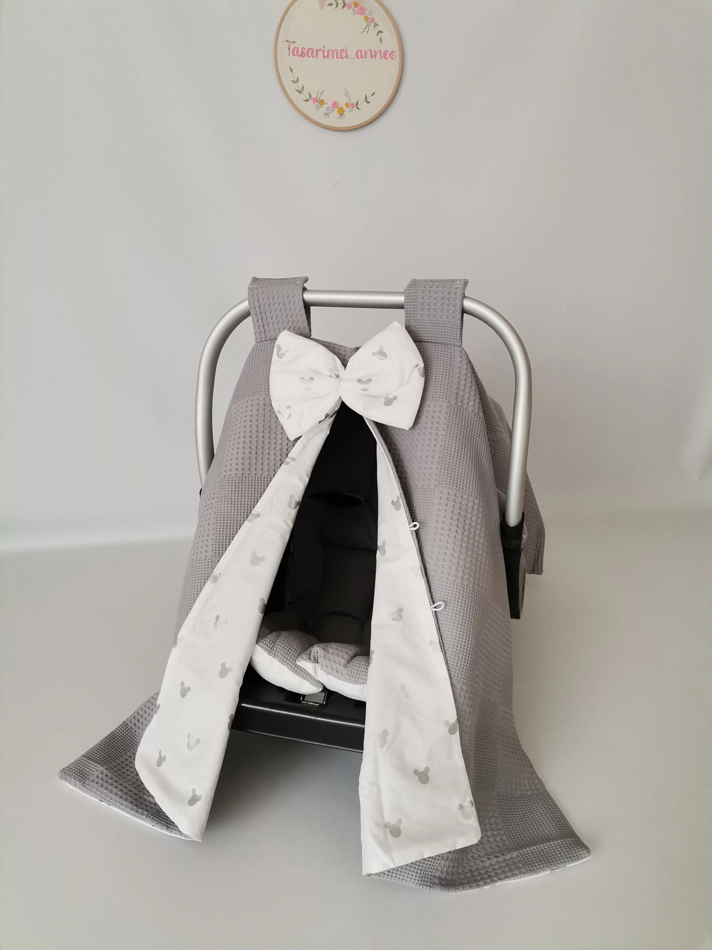 Koyu gri klasik (waffle) Pike ve gümüs mickeyli poplin kumaştan üretilen Puset Örtüsü
