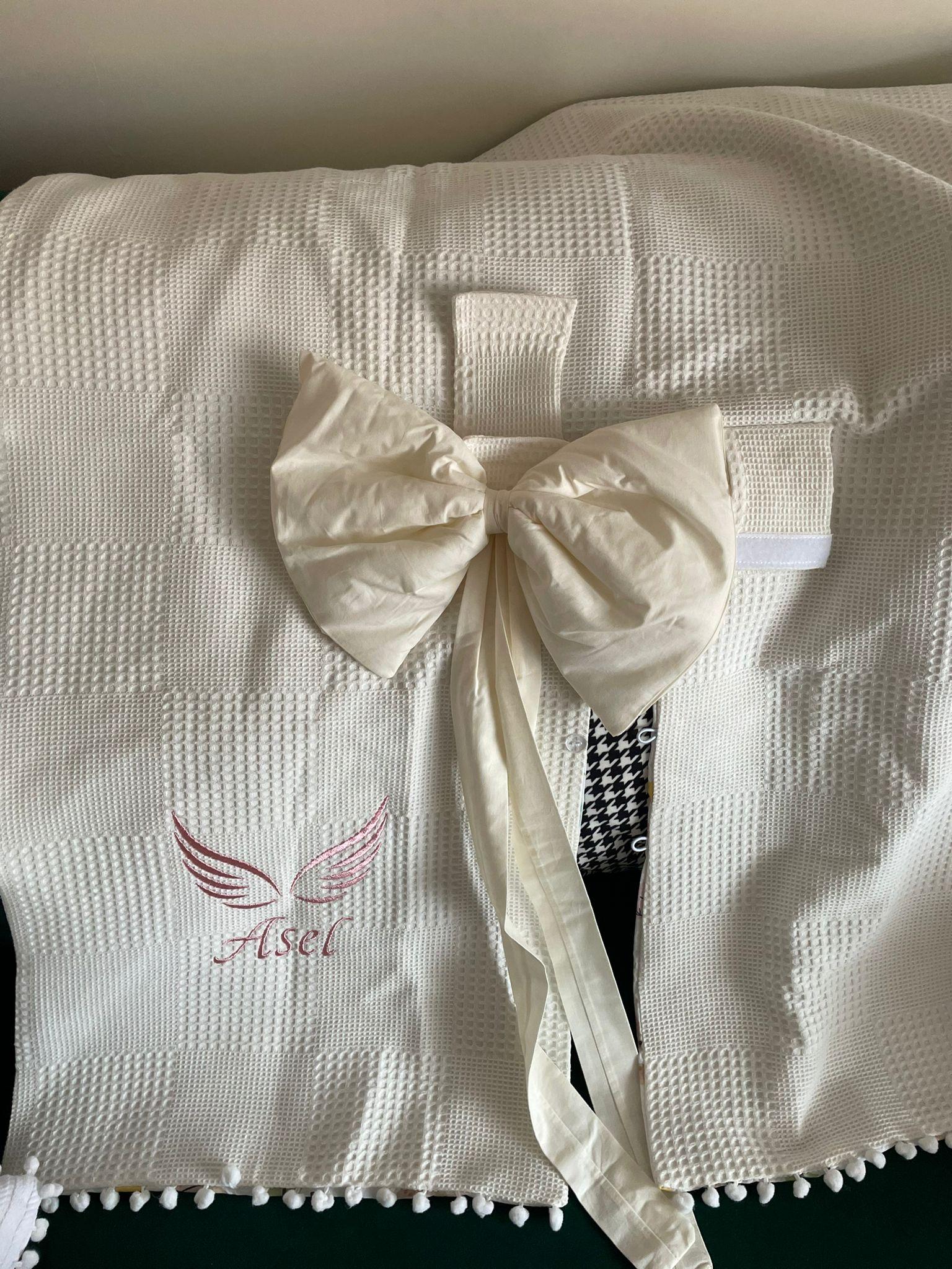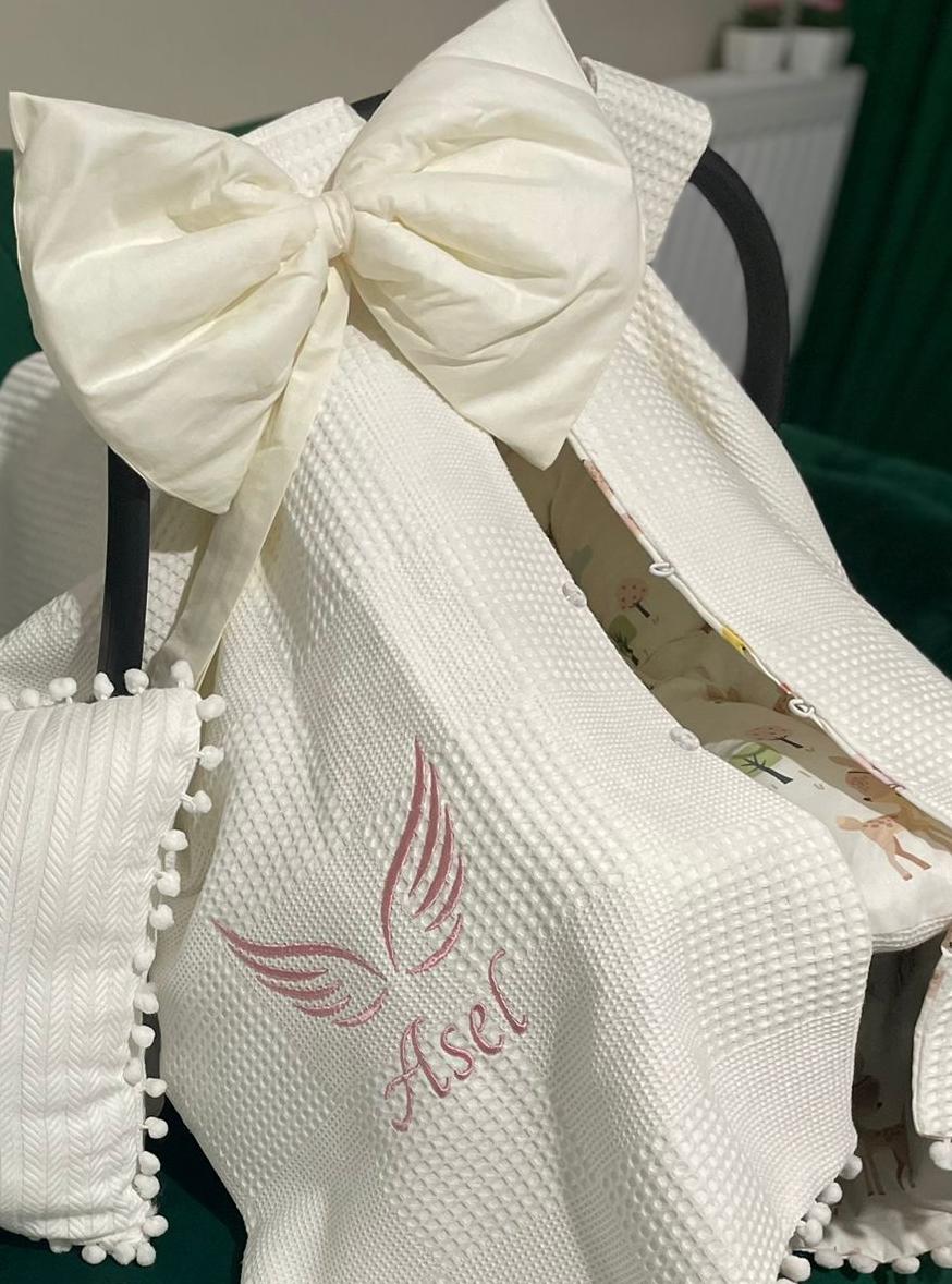 Krem klasik (waffle) Pike ve karacalı poplin kumaştan üretilen isim ve nakış işlemeli Puset Örtüsü