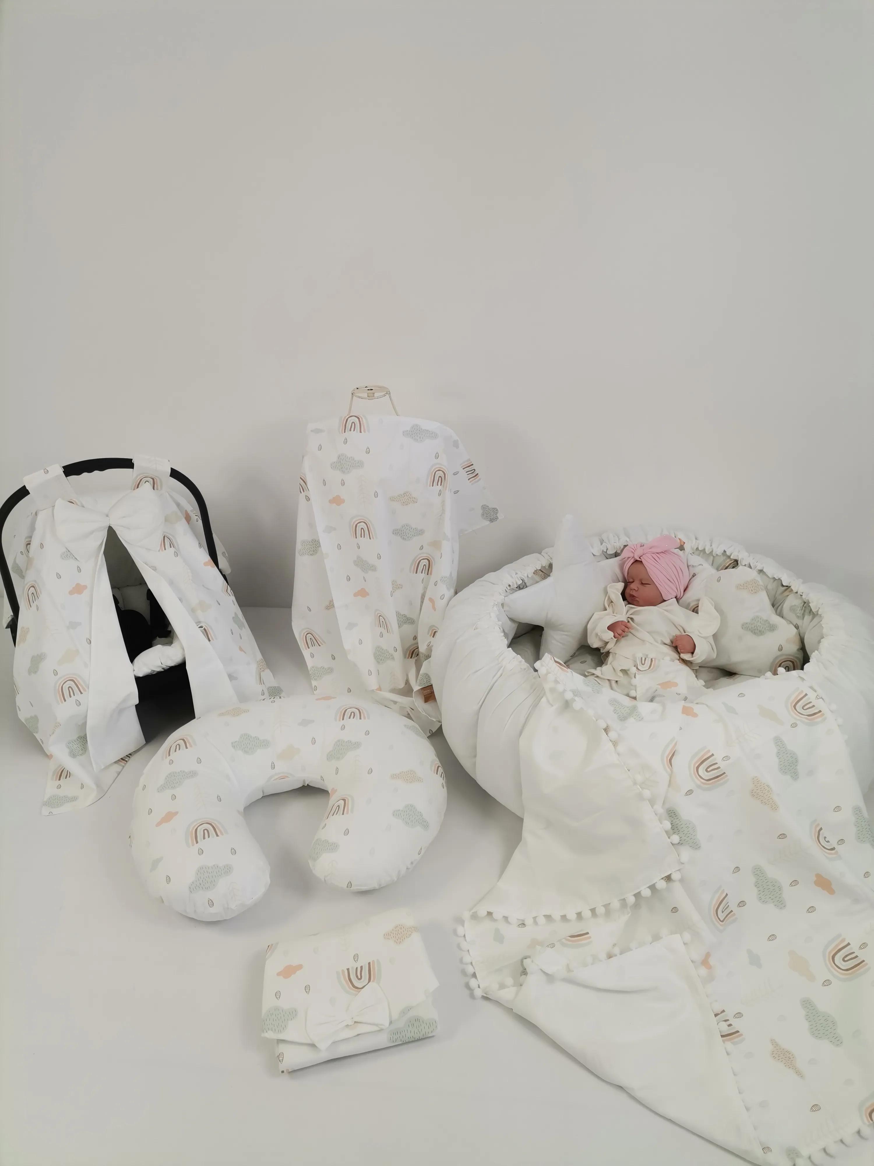 Gökkuşağı desenli poplin ve beyaz poplin kumaşlardan üretilen Yuvarlak babynestli 9 parça setimiz ;