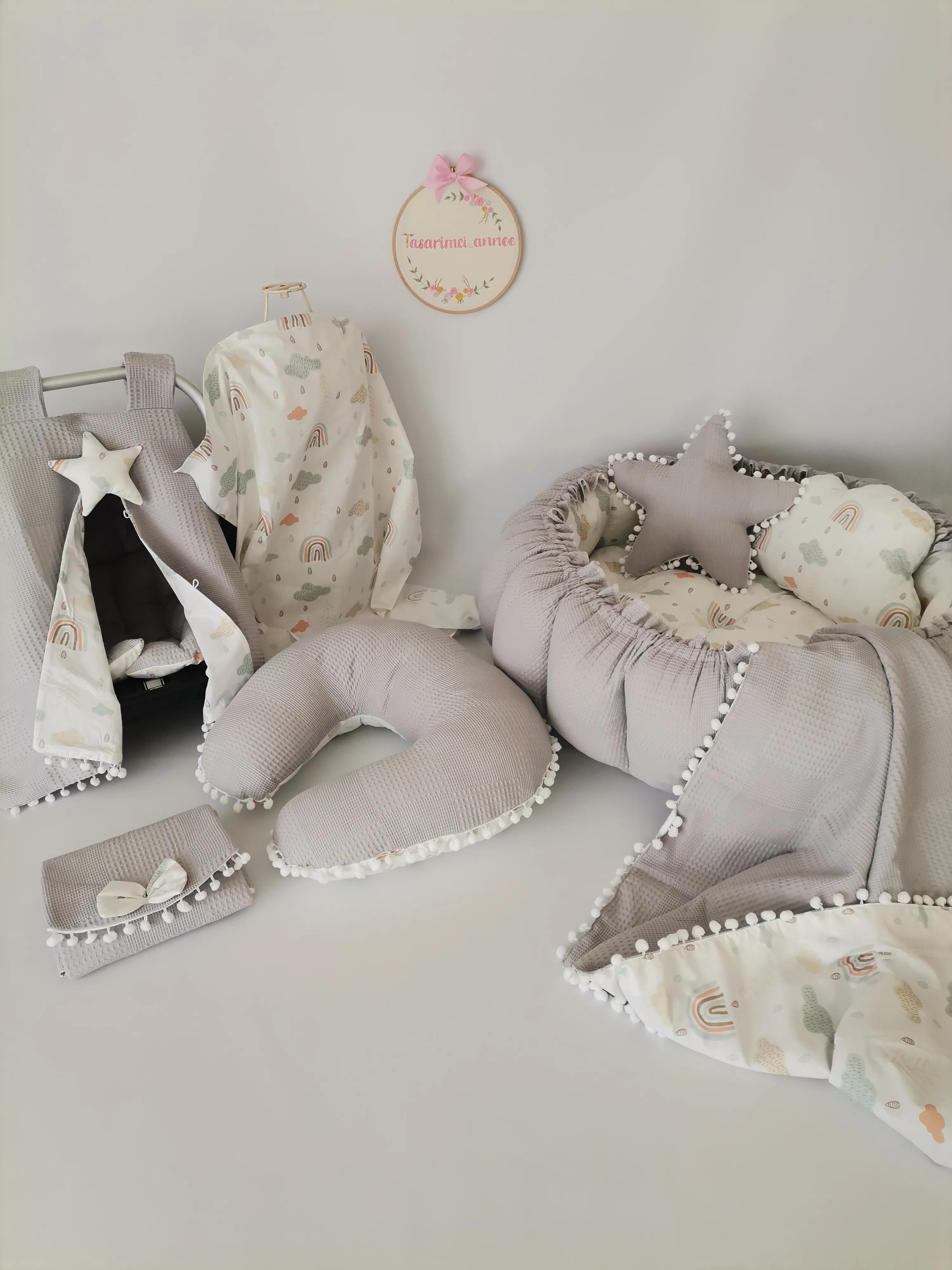 Gri Pike ve gökkuşağı desenli poplin kumaştan üretilen Yuvarlak babynestli 9 lu setimiz ;