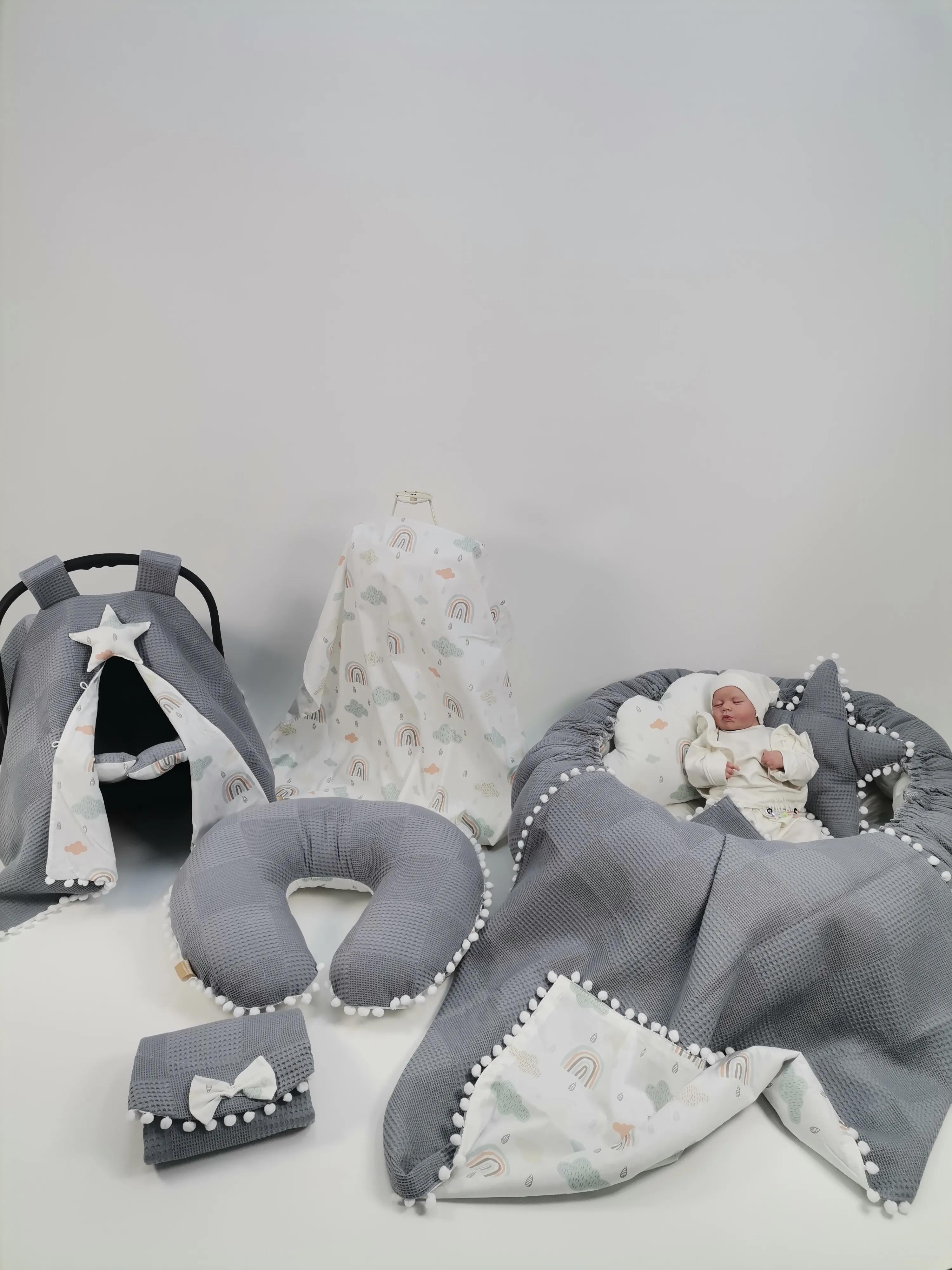Koyu Gri Pike ve gökkuşağı desenli poplin kumaştan üretilen Yuvarlak babynestli 9 lu setimiz ;