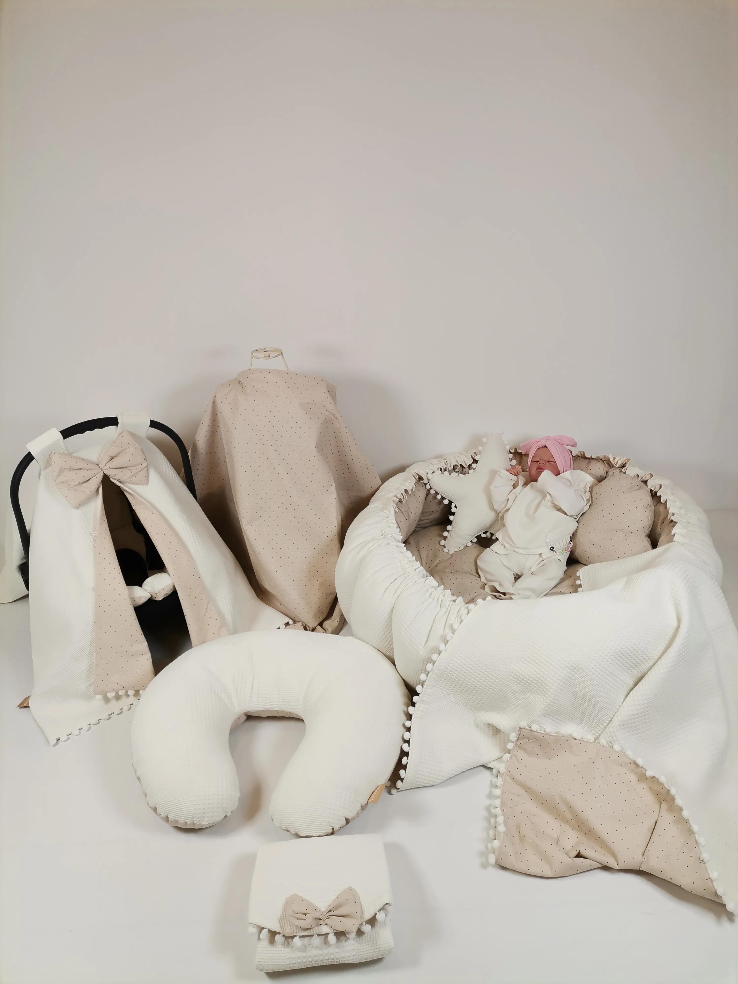 Krem klasik pike ve bej zemin üstü kahve rengi puantiyeli poplin kumaştan üretilen Yuvarlak babynestli 9 lu setimiz ;