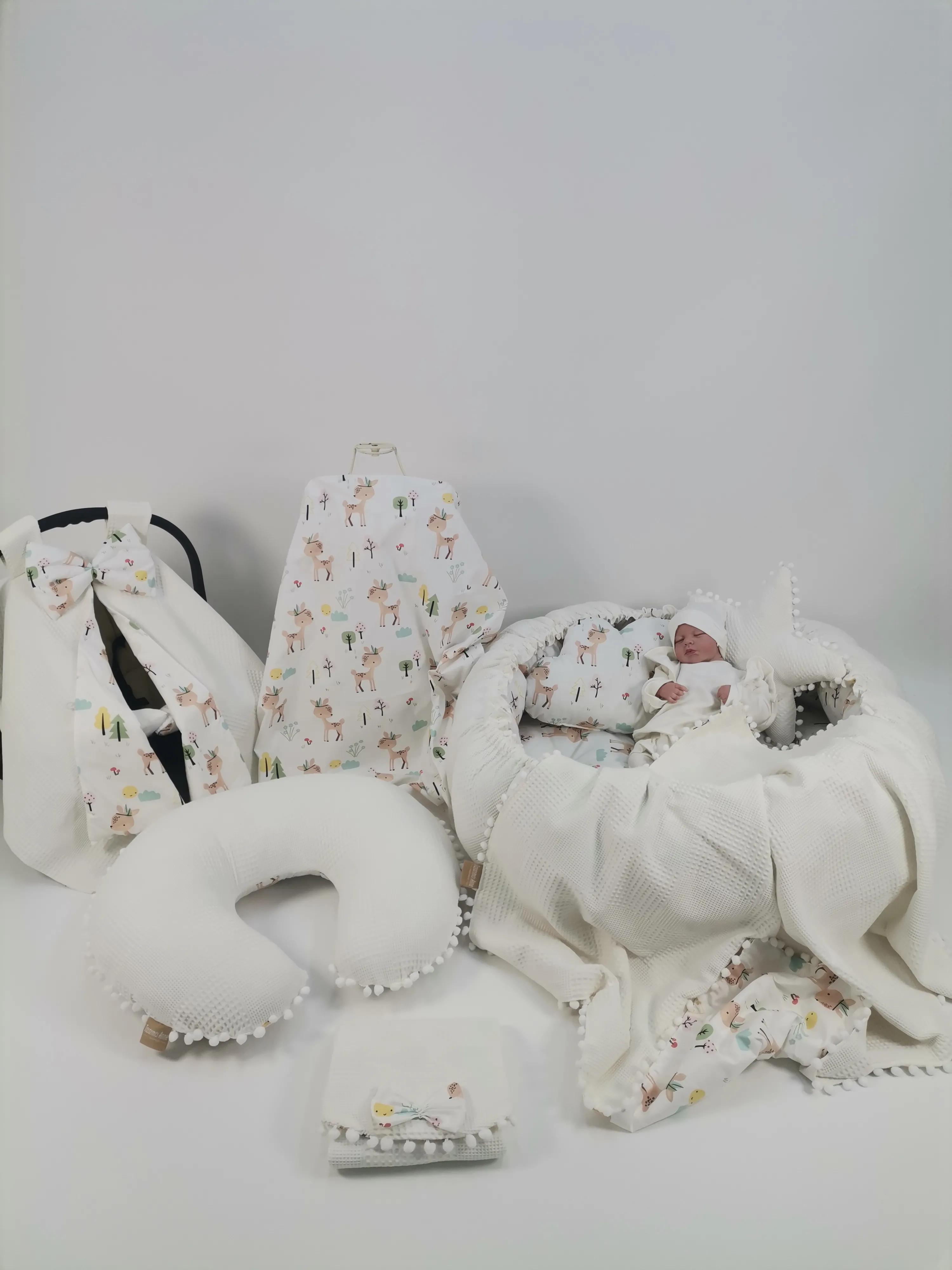 Waffle ve karacalı poplin kumaştan üretilen Yuvarlak babynestli 9 lu setimiz ;