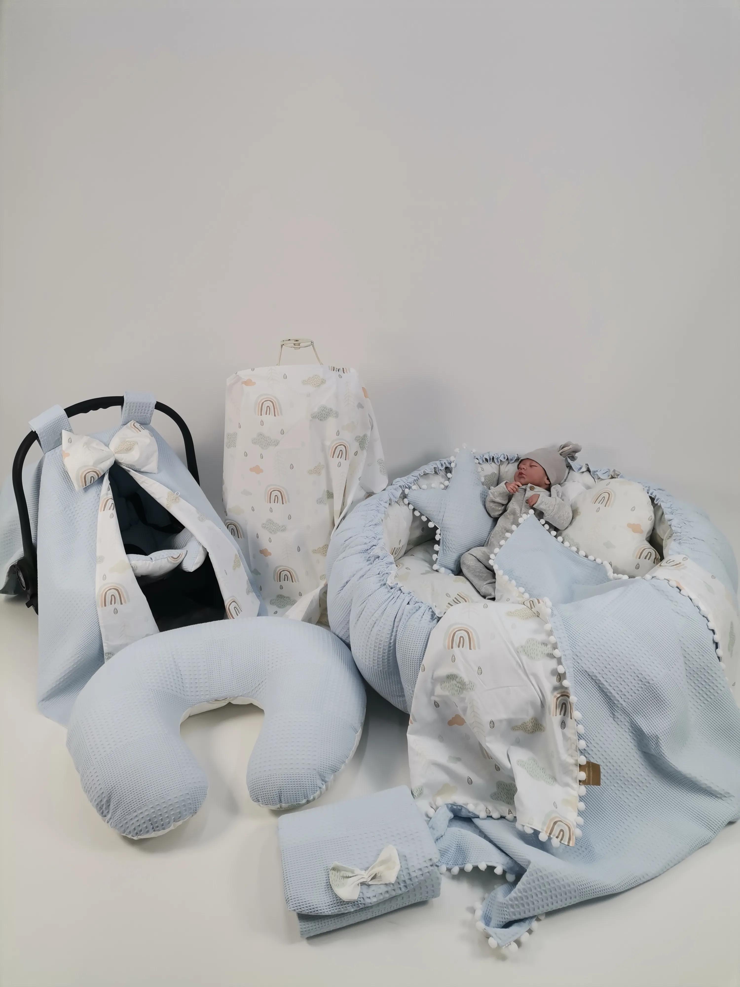 Mavi waffle pike ve gökkuşağı desenli poplin kumaştan üretilen Yuvarlak babynestli 9 lu setimiz ;