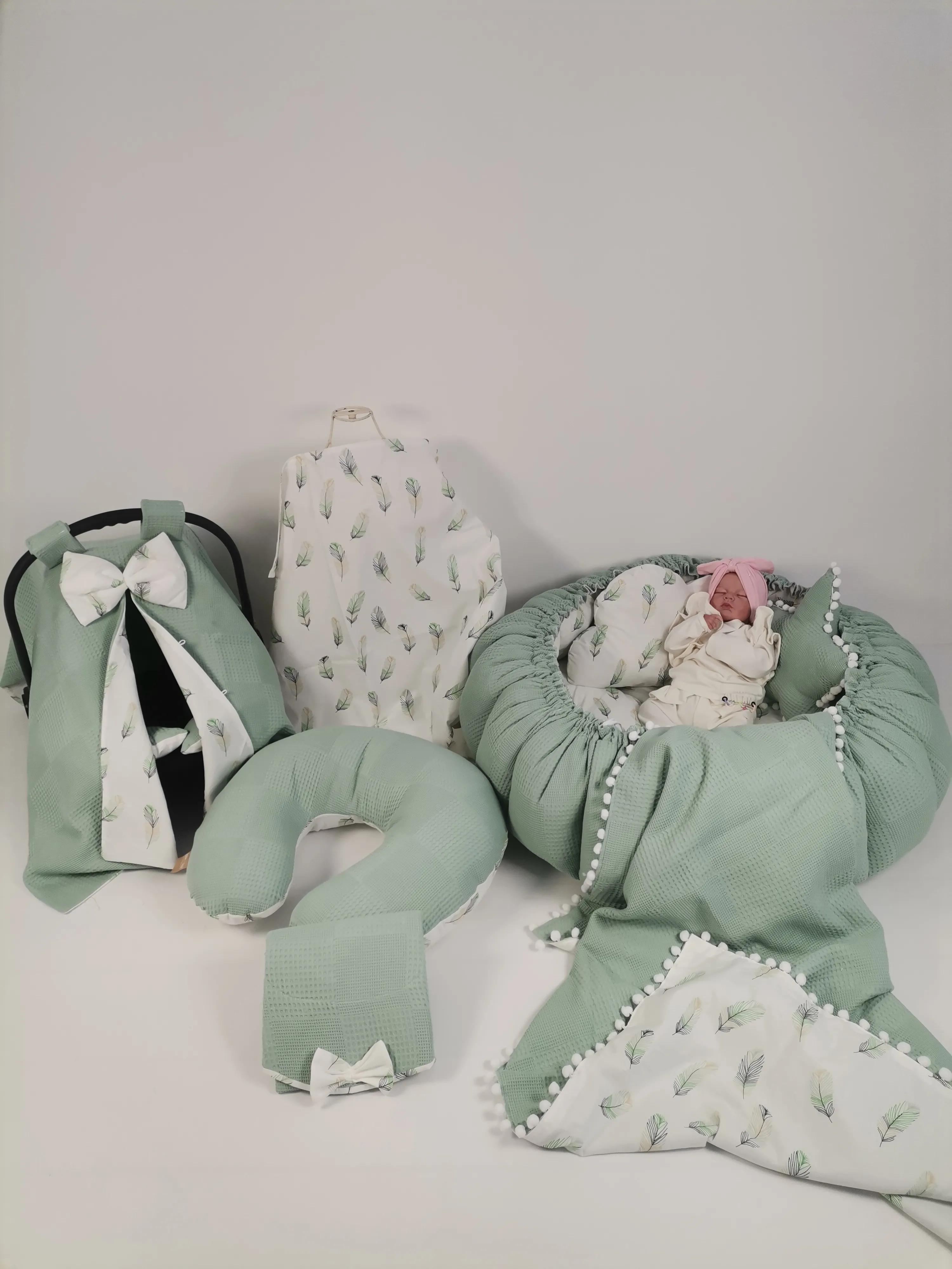 Yeşil waffle pike ve yeşil tüy desenli poplin kumaştan üretilen Yuvarlak babynestli 9 lu setimiz ;