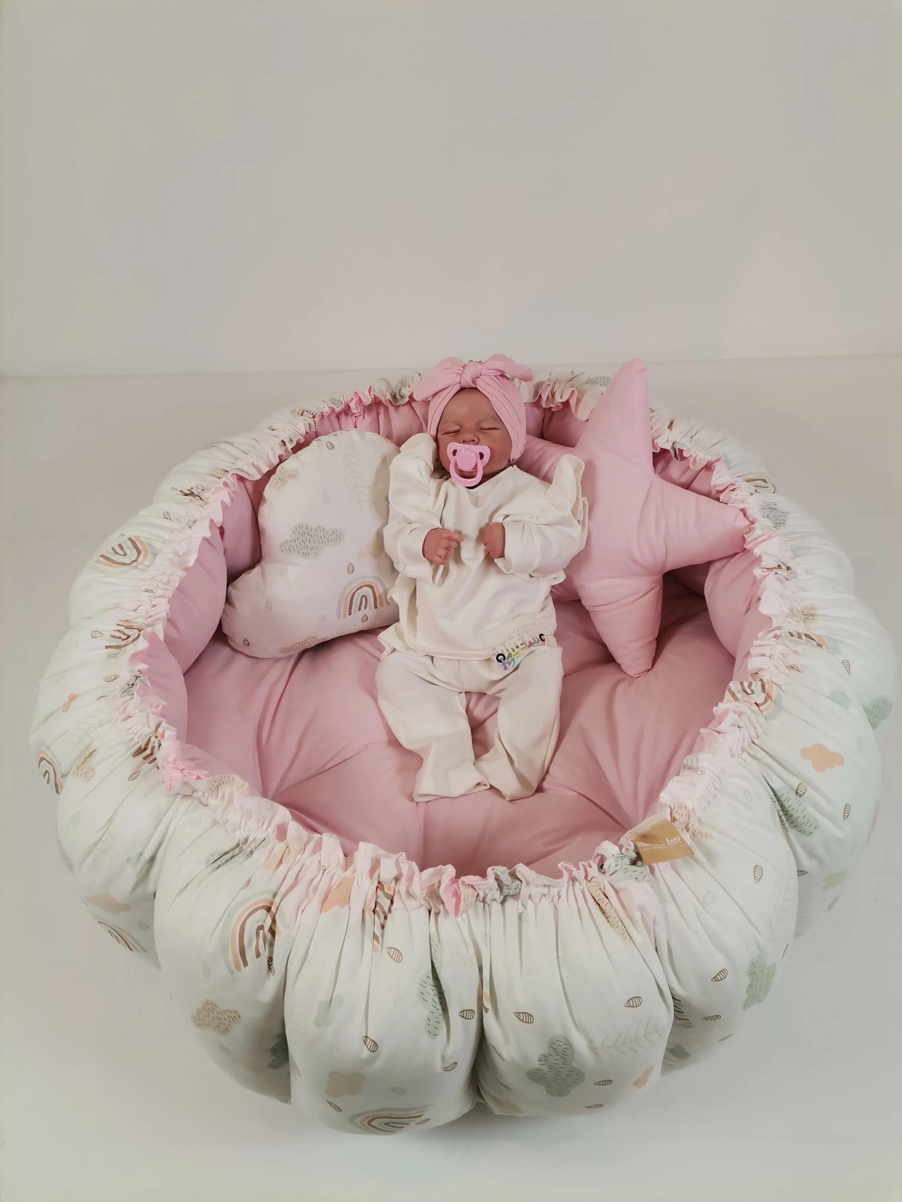 Gökkuşağı desenli poplin ile pembe renk poplin kumaştan üretilen Yuvarlak babynestimiz ;