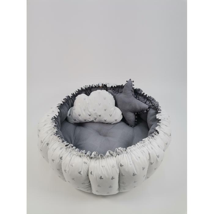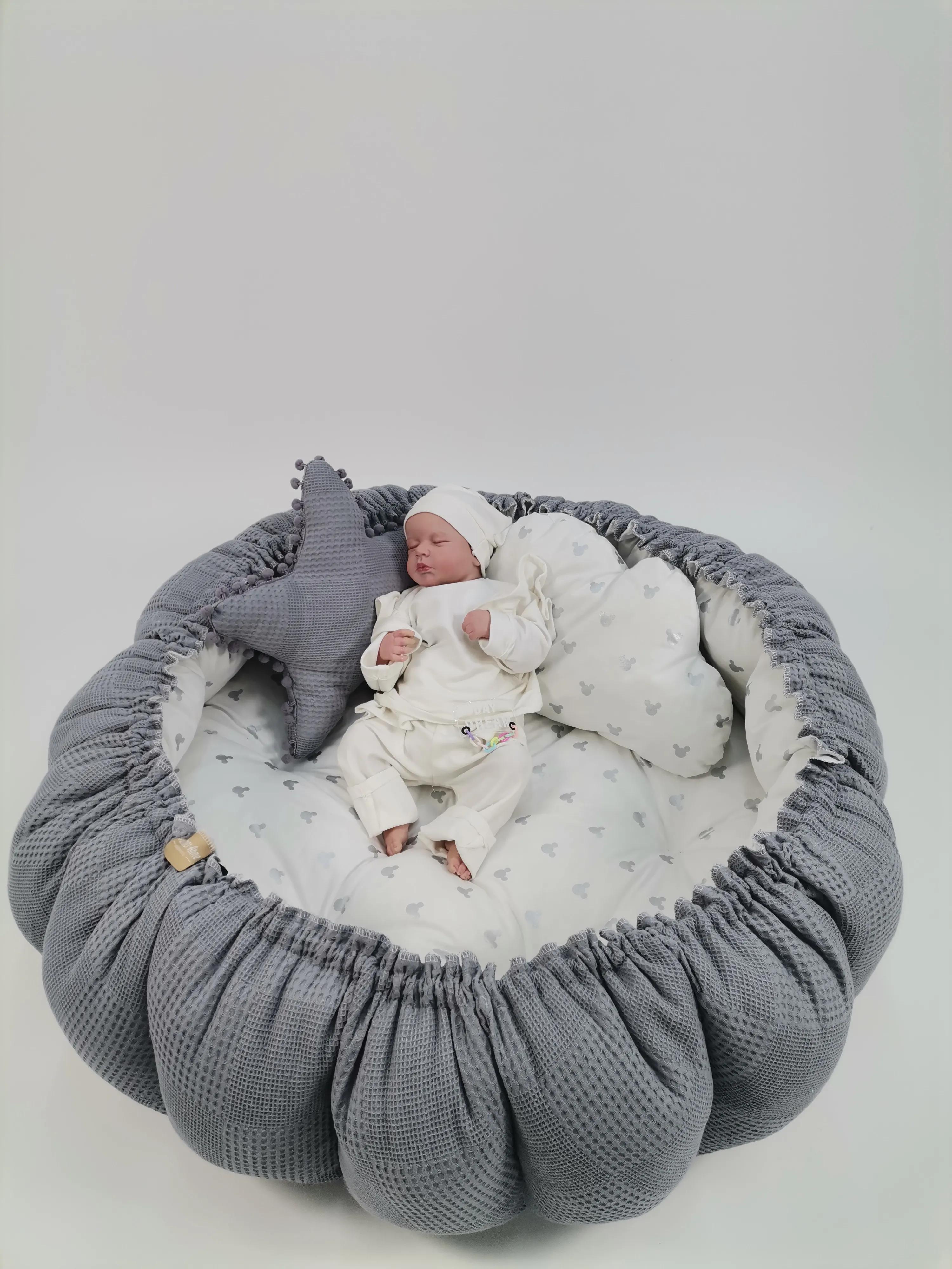 Yuvarlak babynest koyu gri waffle pike - gümüş mickeyli poplin