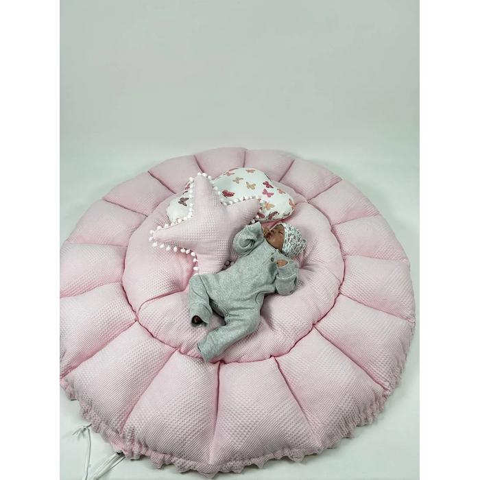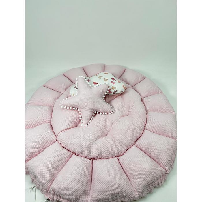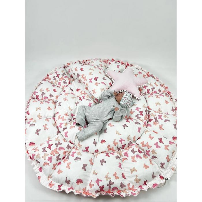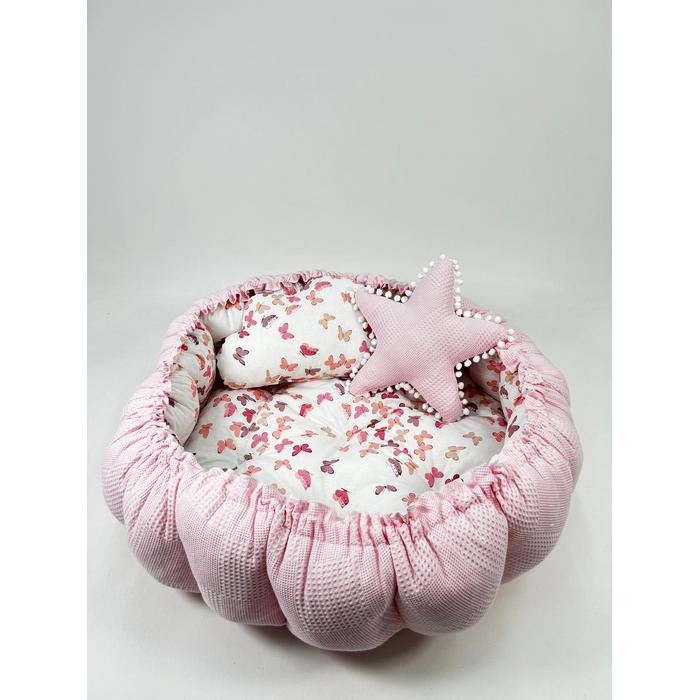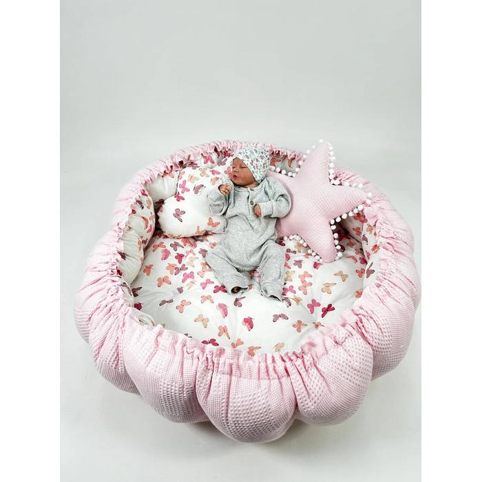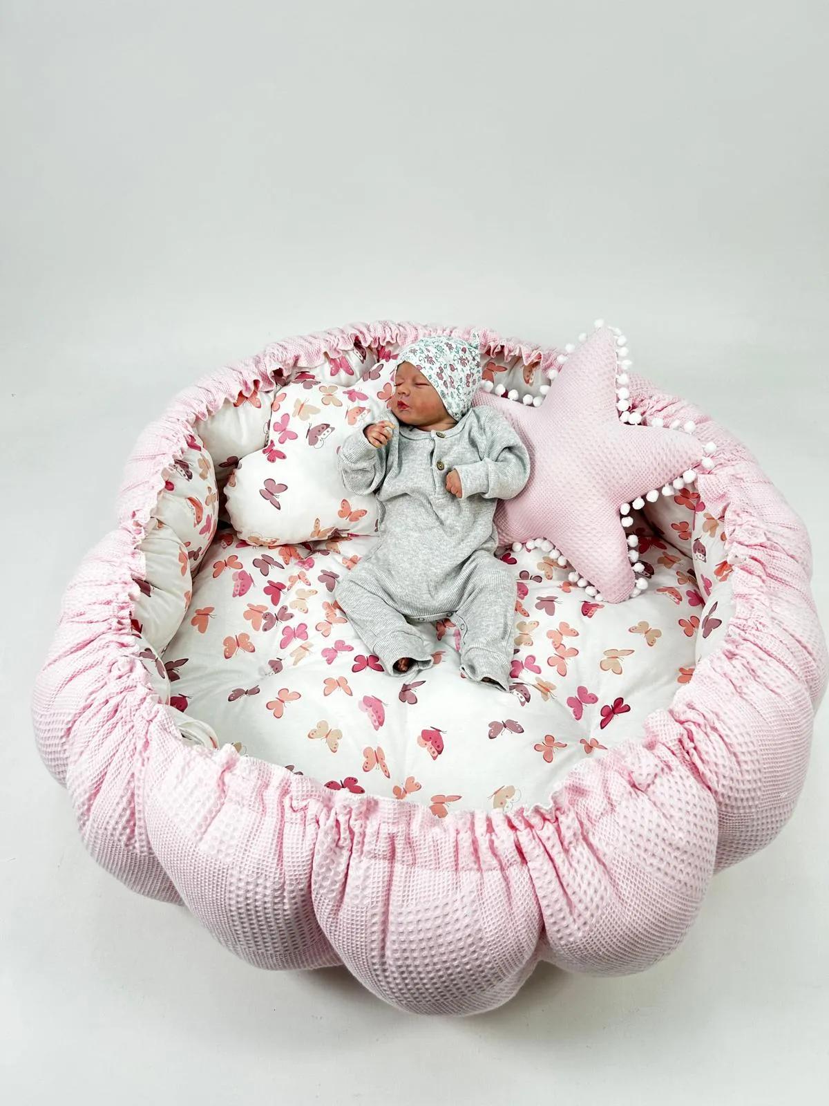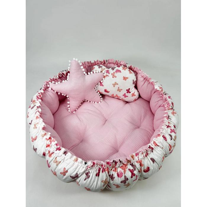 Pembe pike ve pudra kelebek desenli poplin kumaşlardan üretilen Yuvarlak babynestimiz ;
