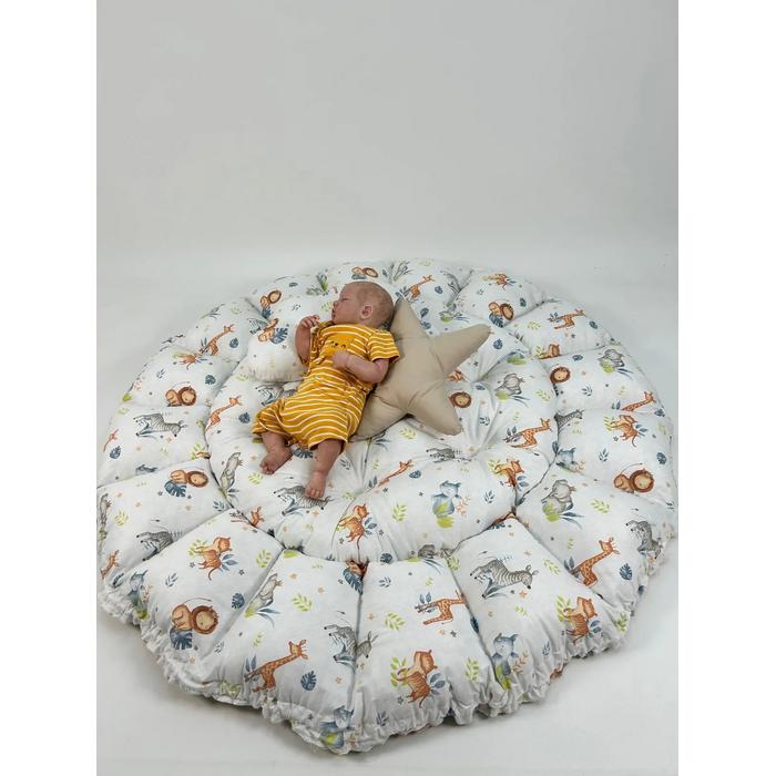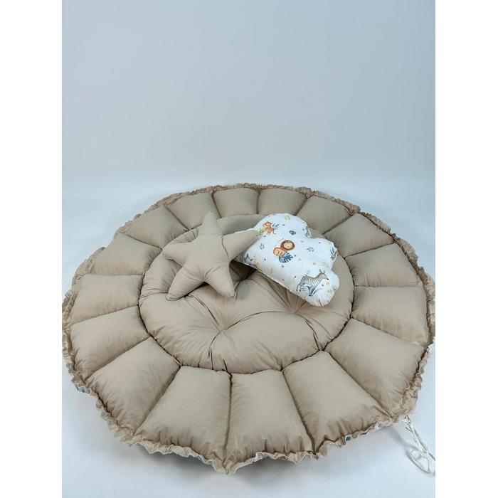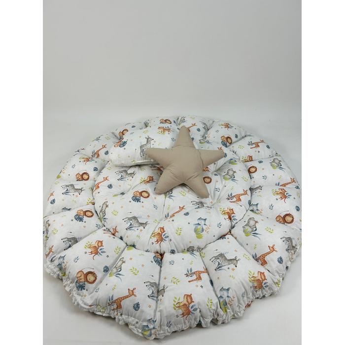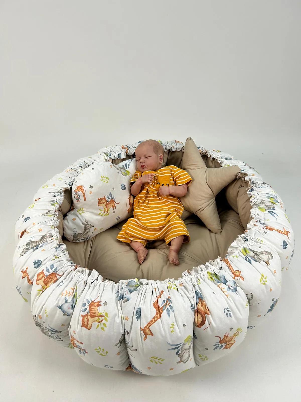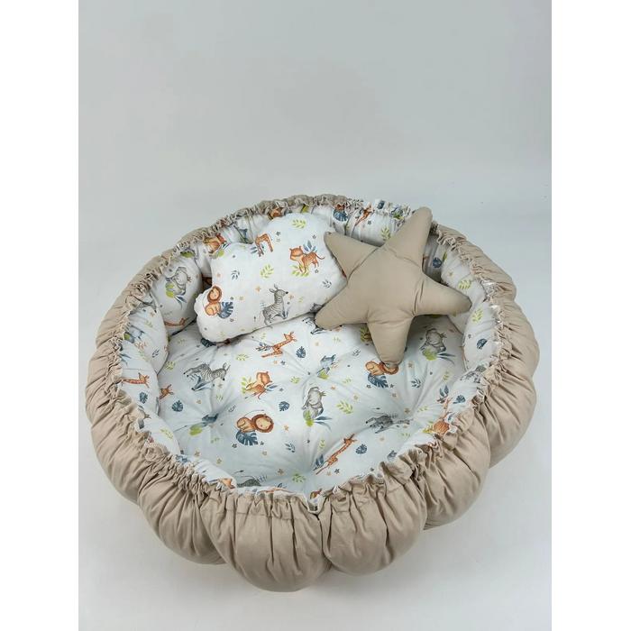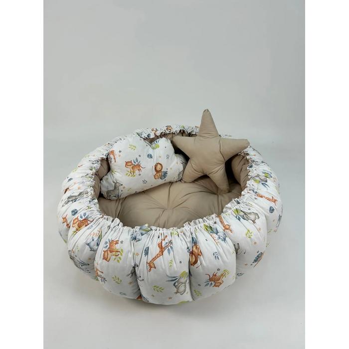 Bej ve sevimli hayvanlar desenli poplin kumaşlardan üretilen Yuvarlak babynestimiz ;