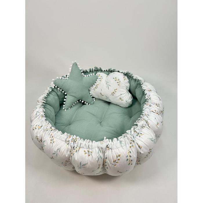Yeşil waffle pike ve yeşil zeytindalı desenli poplin kumaşlardan üretilen Yuvarlak babynestimiz ;