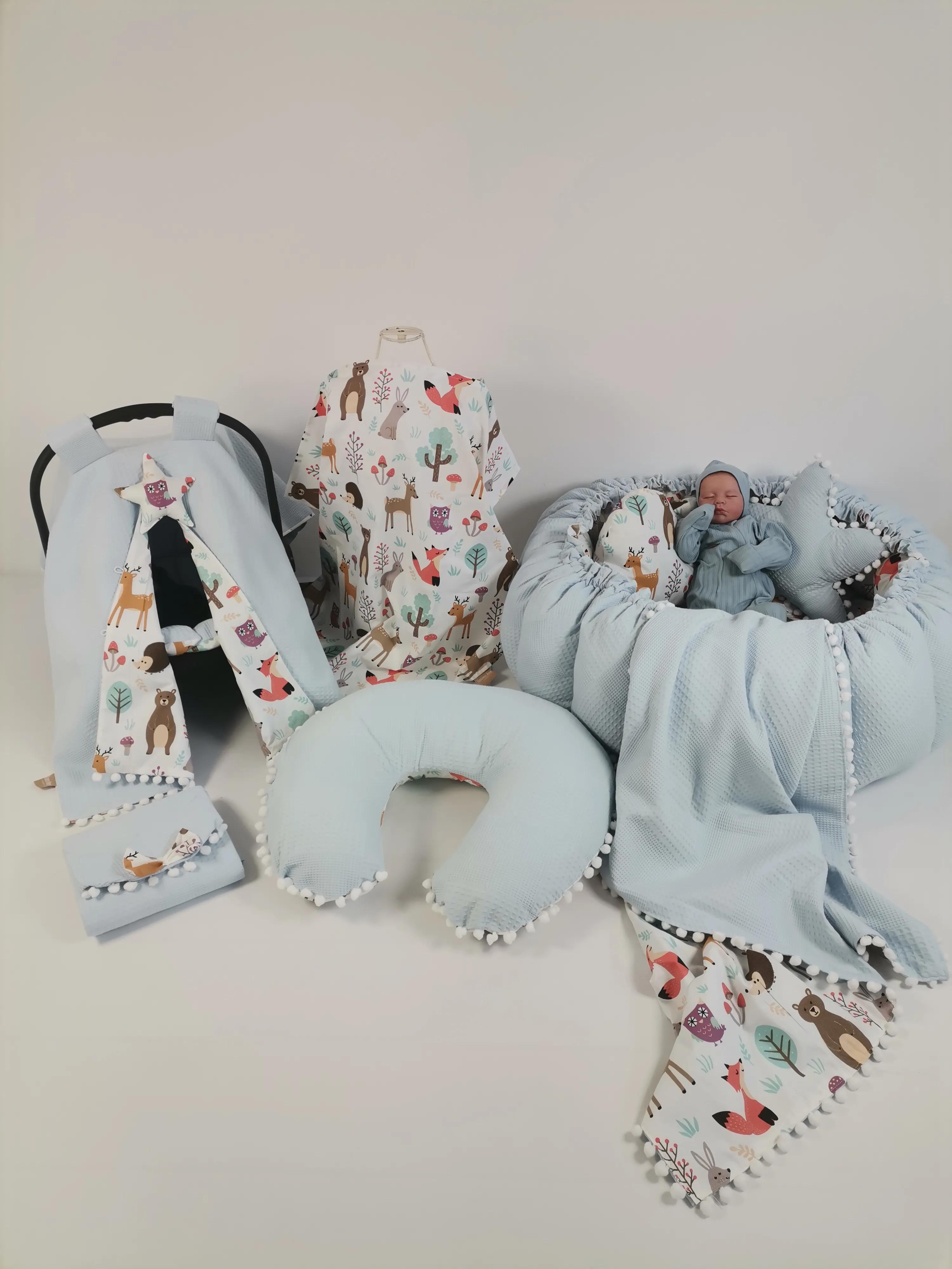 Mavi waffle pike ve hayvan figürlü poplin kumaştan üretilen Yuvarlak babynestli 9 lu setimiz ;