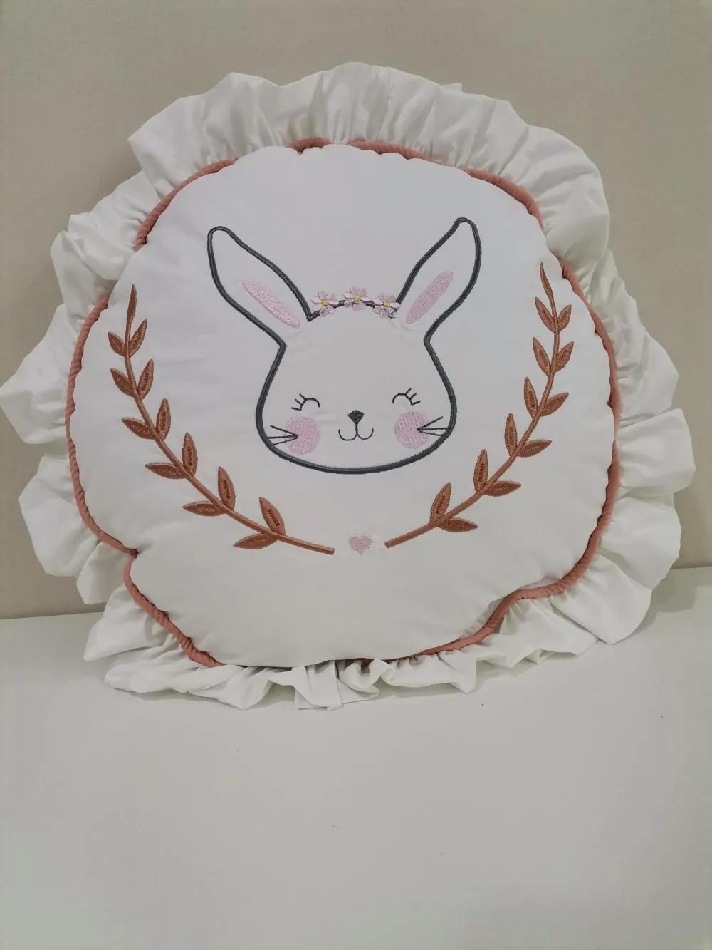 Krem rengi Poplin kumaştan üretilen fırfırlı Tavşan Nakışlı Yastık